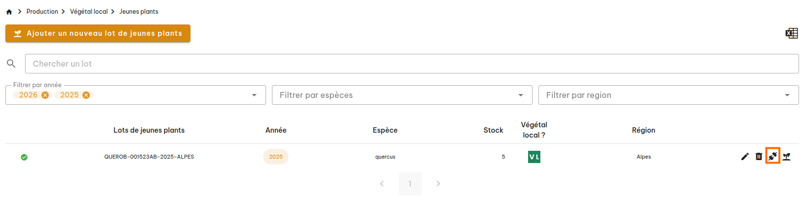 Dans la liste de vos jeunes plants, cliquez sur l'icône suivante pour le lot que vous souhaitez commercialiser directement en achat/revente :